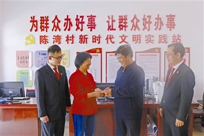 在法官的見證下,村委會干部將補(bǔ)償款送到陳某手中。