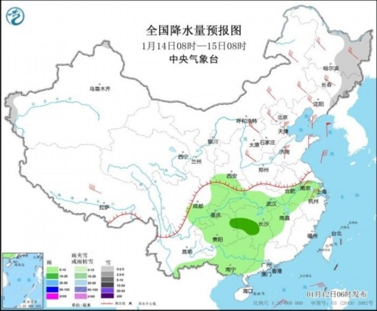 全國降水量預(yù)報(bào)圖(1月14日08時(shí)-15日08時(shí))