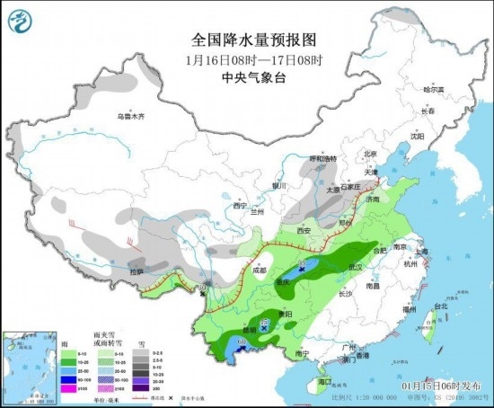 圖1 全國降水量預報圖(1月15日08時-16日08時)