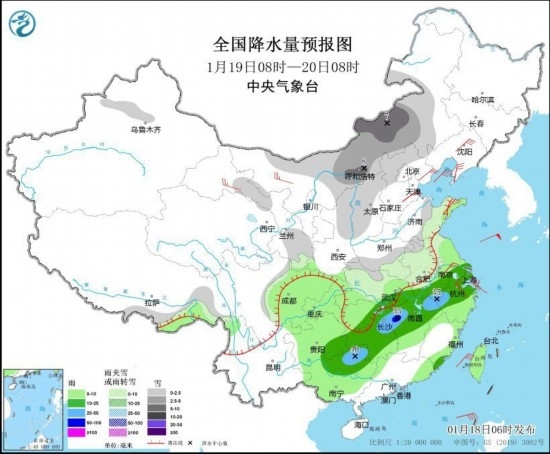 圖1 全國降水量預報圖(1月18日08時-19日08時)