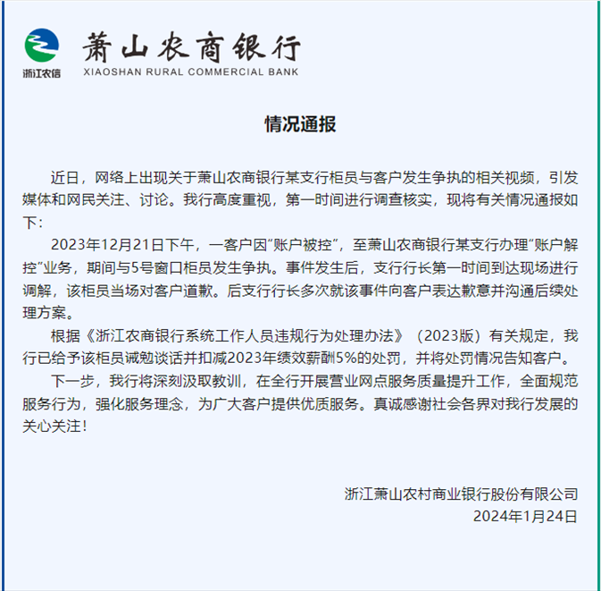 ·杭州蕭山農(nóng)商銀行柜員對(duì)客戶(hù)大吼“滾”,銀行回應(yīng):扣減5%績(jī)效。