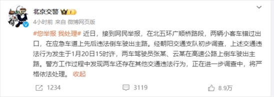 ·網民舉報“北五環(huán)廣順橋路段兩車在高速公路上倒車”,北京交警通報。