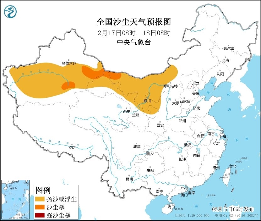 受冷空氣大風影響,預計2月17日08時至18日08時,新疆東部和南疆盆地、內(nèi)蒙古中西部、甘肅北部、寧夏大部、陜西西北部等地的部分地區(qū)有揚沙或浮塵天氣,新疆東部和南疆盆地東南部、內(nèi)蒙古西部、甘肅北部等局地有沙塵暴。