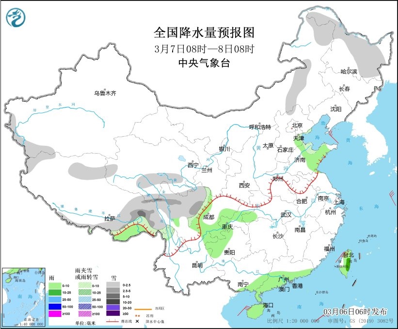 3月6日08時(shí)至7日08時(shí),西藏東部和南部、青海南部、川西高原北部、山西北部等地部分地區(qū)有小雪或雨夾雪,其中,西藏東部、川西高原北部等地部分地區(qū)有中到大雪。江南東部和南部、西南地區(qū)東部、華南中東部、臺灣島等地部分地區(qū)有小雨,其中,臺灣島北部等地部分地區(qū)有中雨。內(nèi)蒙古西北部部分地區(qū)有4~5級風(fēng)(見圖1)。
