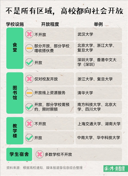 武漢大學(xué)在今年櫻花開(kāi)放期間校園管理的通知里就明確寫出,“校內(nèi)教學(xué)、科研、辦公樓(館、室、所)和學(xué)生宿舍等場(chǎng)所謝絕公眾參觀,學(xué)生食堂不提供公眾就餐服務(wù)”。
