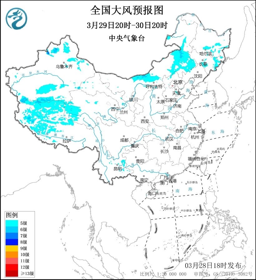預(yù)計(jì),3月28日20時(shí)至29日20時(shí),內(nèi)蒙古大部、吉林西部、遼寧南部、甘肅東部、寧夏北部等地有5~6級、陣風(fēng)7~9級風(fēng);黃海中部和南部海域、東海東北部海域?qū)⒂?~8級、陣風(fēng)9級風(fēng),其中東海東北部的部分海域風(fēng)力可達(dá)9級、陣風(fēng)10級。