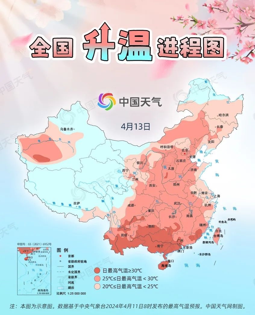 眼下,全國(guó)大部處于冷空氣影響間歇期,升溫是主旋律。預(yù)計(jì)今起三天(4月11日至13日),我國(guó)從北到南都將開啟回暖進(jìn)程,最高氣溫25℃以上的區(qū)域幾乎覆蓋整個(gè)中東部,波及20余省份,東北、西北地區(qū)氣溫將大面積創(chuàng)今年以來(lái)新高,北方不少地方還會(huì)體驗(yàn)到常年5月中旬才有的超前暖熱。中國(guó)天氣網(wǎng)推出全國(guó)升溫進(jìn)程圖,看看哪些地方將沖擊30℃。