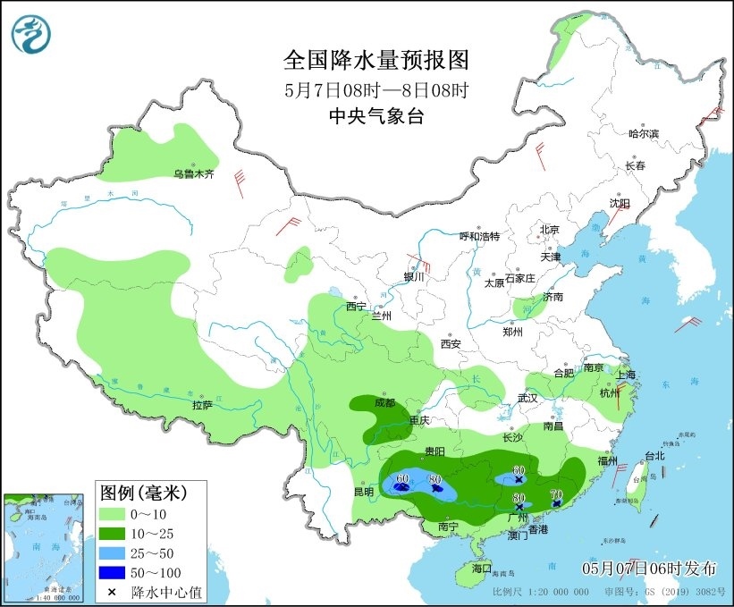 人民網北京5月7日電 (溫璐、高清揚)據(jù)中央氣象臺網站消息,昨日,廣西中南部、廣東中西部、海南島中部及貴州中北部、云南東南部等地部分地區(qū)出現(xiàn)大到暴雨,廣西玉林,廣東肇慶、佛山、清遠,海南白沙,貴州黔南州、畢節(jié)等局地大暴雨。預計未來三天,南方降雨呈現(xiàn)西強東弱的趨勢,江南、華南等地降雨有所減弱,轉為陰雨天氣,西南地區(qū)降雨增多,四川盆地南部、云南中部和東部、貴州西部和南部等地有中到大雨,局地暴雨。
