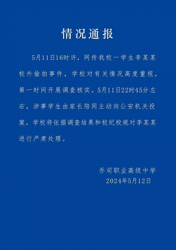 央視網(wǎng)消息:杭州市喬司職業(yè)高級中學(xué)5月12日發(fā)布情況通報,5月11日16時許,網(wǎng)傳我校一學(xué)生李某某校外偷拍事件,學(xué)校對有關(guān)情況高度重視,第一時問開展調(diào)查核實(shí)。5月11日22時45分左右,涉事學(xué)生由家長陪同主動向公安機(jī)關(guān)投案。學(xué)校將依據(jù)調(diào)查結(jié)果和校紀(jì)校規(guī)對李某某進(jìn)行嚴(yán)肅處理。