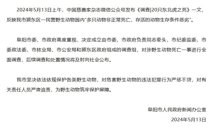 央視網(wǎng)消息:據(jù)“阜陽發(fā)布”微信公眾號消息,阜陽市人民政府新聞辦公室發(fā)布情況通報(bào),2024年5月13日上午,中國慈善家雜志微信公眾號發(fā)布《調(diào)查|20只東北虎之死》一文,反映阜陽市潁東區(qū)一民營野生動(dòng)物園內(nèi)“多只動(dòng)物非正常死亡,存活的動(dòng)物生存條件惡劣”。