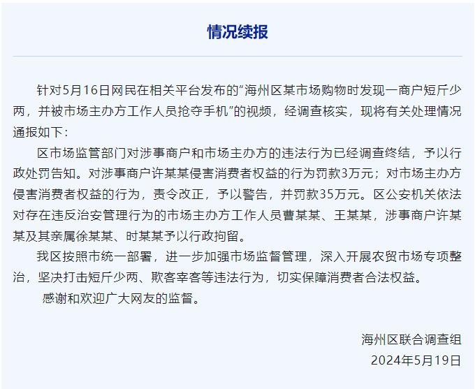 央視網(wǎng)消息:據(jù)“今日海州”微信公眾號消息,針對5月16日網(wǎng)民在相關(guān)平臺發(fā)布的“海州區(qū)某市場購物時發(fā)現(xiàn)一商戶短斤少兩,并被市場主辦方工作人員搶奪手機(jī)”的視頻,經(jīng)調(diào)查核實,現(xiàn)將有關(guān)處理情況通報如下:區(qū)市場監(jiān)管部門對涉事商戶和市場主辦方的違法行為已經(jīng)調(diào)查終結(jié),予以行政處罰告知。對涉事商戶許某某侵害消費者權(quán)益的行為罰款3萬元;對市場主辦方侵害消費者權(quán)益的行為,責(zé)令改正,予以警告,并罰款35萬元。區(qū)公安機(jī)關(guān)依法對存在違反治安管理行為的市場主辦方工作人員曹某某、王某某,涉事商戶許某某及其親屬徐某某、時某某予以行政拘留。