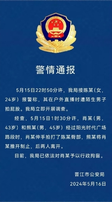 ·晉江警方通報“殘疾女子街頭直播遭男子拍臀”:男子被行拘。