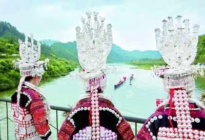 三位身著苗族節(jié)日盛裝的少女站在橋上觀看龍舟比賽。