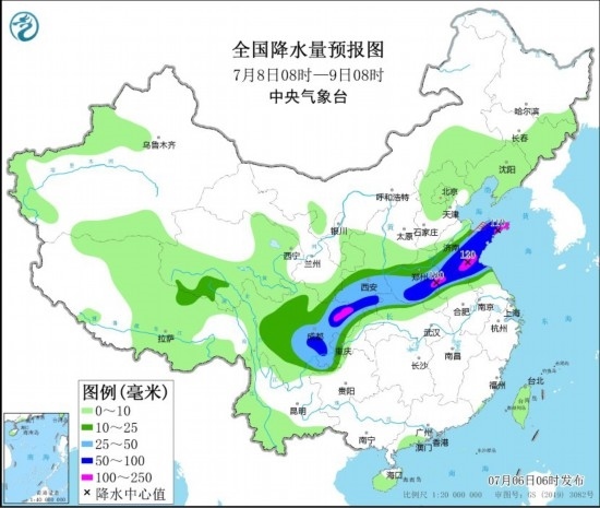 7月7日08時至8日08時,陜西中南部、黃淮大部等地部分地區(qū)有大到暴雨,其中,山東中東部和南部等地部分地區(qū)有大暴雨,山東南部等地局地特大暴雨(250~280毫米)。內(nèi)蒙古中部部分地區(qū)有4~5級風。