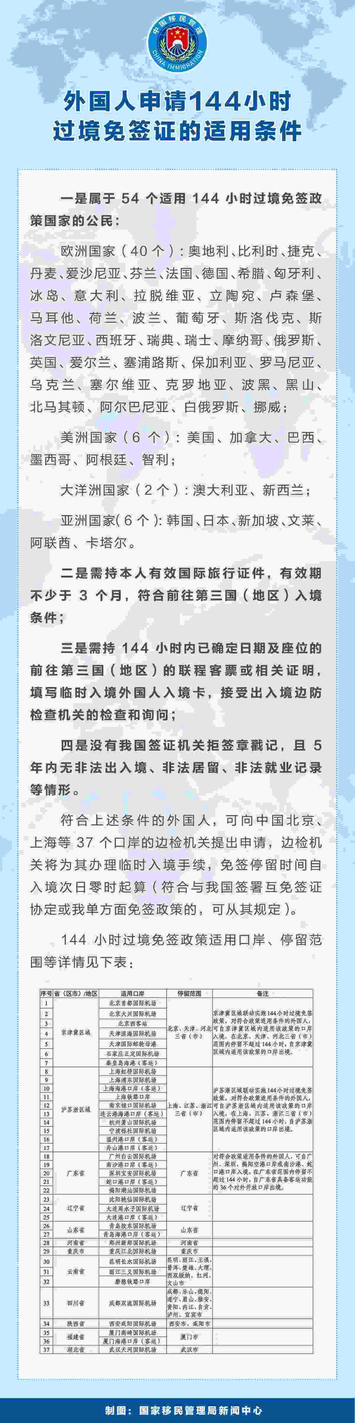 據(jù)了解,截至目前,國(guó)家移民管理局已在北京,天津,河北石家莊、秦皇島,遼寧沈陽(yáng)、大連,上海,江蘇南京、連云港,浙江杭州、寧波、溫州、舟山,河南鄭州,廣東廣州、深圳、揭陽(yáng),山東青島,重慶,四川成都,陜西西安,福建廈門(mén),湖北武漢,云南昆明、麗江、西雙版納等地的37個(gè)口岸實(shí)施144小時(shí)過(guò)境免簽政策。美國(guó)、加拿大、英國(guó)等54國(guó)公民持有效國(guó)際旅行證件和144小時(shí)內(nèi)確定日期及座位的聯(lián)程客票從上述口岸過(guò)境前往第三國(guó)(地區(qū)),可免辦簽證在規(guī)定區(qū)域內(nèi)停留不超過(guò)144小時(shí),停留期間可從事旅游、商務(wù)、訪問(wèn)、探親等短期活動(dòng)(符合與我國(guó)簽署互免簽證協(xié)定或我單方面免簽政策的,可從其規(guī)定)。