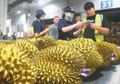 日前,在廣西憑祥市友誼關(guān)口岸海關(guān)查驗(yàn)平臺(tái),工作人員查驗(yàn)一批進(jìn)口榴蓮。新華社記者 陸波岸攝