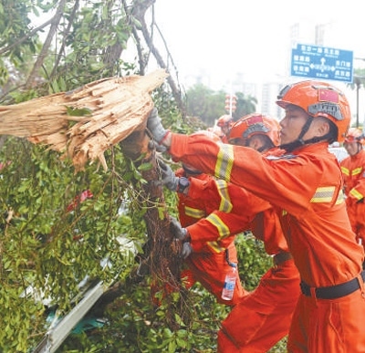 9月7日,海南省??谑泄ぷ魅藛T在海口市濱海大道上清理被風(fēng)吹倒的樹木。新華社記者 楊冠宇攝