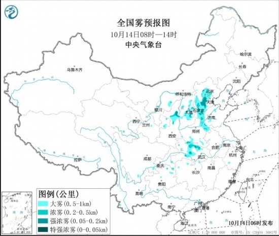 預計,10月14日早晨至上午,河北中南部、北京、天津西部、山東西部、山西中東部、陜西北部、河南東北部和南部部分地區(qū)、湖北中部等地有大霧天氣,其中,河北中南部、北京西部、山西中部、陜西北部、湖北中部等地的部分地區(qū)有能見度低于500米的濃霧,局地有不足200米的強濃霧。中央氣象臺14日06時繼續(xù)發(fā)布大霧黃色預警。此外,14日,華北中南部、黃淮中西部、汾渭平原等地大氣擴散條件較差,有輕至中度霾,其中,北京南部、河北西部沿山部分地區(qū)有重度霾。14日夜間起,受冷空氣影響,上述地區(qū)霧霾天氣自北向南逐漸減弱或消散。
