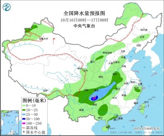 10月16日8時至17日8時,四川東南部、重慶中南部、貴州中北部、湖南西北部、湖北西南部和中部等地部分地區(qū)有中到大雨,其中,四川東南部、貴州北部等地局部地區(qū)有暴雨或大暴雨(100~110毫米)。內蒙古東北部、黑龍江西北部、新疆西部、青海南部、西藏東部、四川西部等地有小到中雪,局地大雪或暴雪。