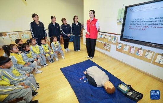 10月22日,國(guó)網(wǎng)浙江湖州供電公司“救”在身邊志愿服務(wù)隊(duì)的黨員志愿者梅月圓(右一)在長(zhǎng)興縣開(kāi)發(fā)區(qū)中心幼兒園開(kāi)展應(yīng)急救護(hù)培訓(xùn)和急救知識(shí)普及。紅十字二級(jí)應(yīng)急救護(hù)師梅月圓是應(yīng)急救護(hù)培訓(xùn)志愿者,也是浙江省三八紅旗手。