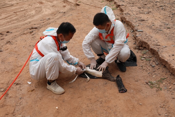 在甘肅張掖黑河濕地國(guó)家級(jí)自然保護(hù)區(qū),單國(guó)鋒(左)和同事為一只黑鸛戴上監(jiān)測(cè)設(shè)備(資料照片)。新華社發(fā)(甘肅張掖黑河濕地國(guó)家級(jí)自然保護(hù)區(qū)管理局供圖)