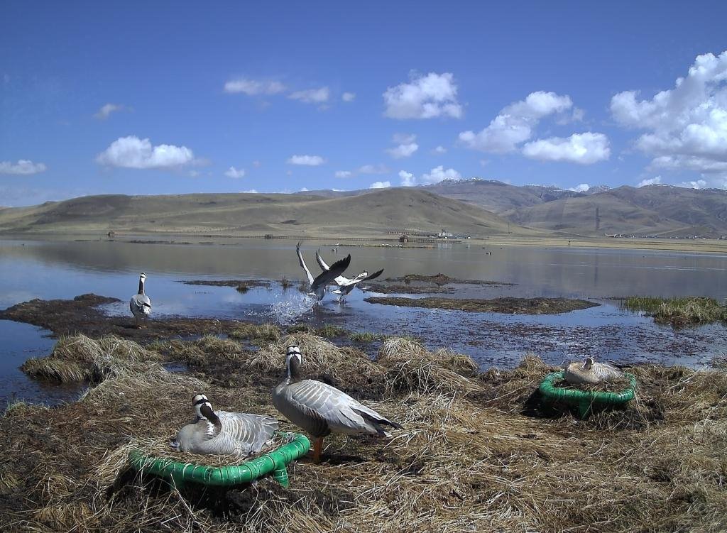 在甘肅尕海則岔國(guó)家級(jí)自然保護(hù)區(qū),棲息的斑頭雁通過人工鳥巢坐巢孵化后代(資料照片)。新華社發(fā)(甘肅尕海則岔國(guó)家級(jí)自然保護(hù)區(qū)管理局供圖)