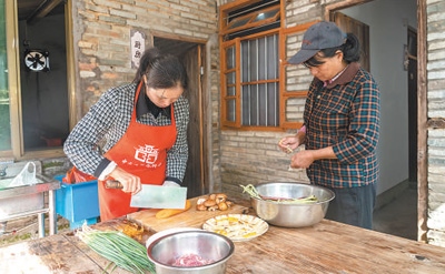 培田村老年食堂廚房內(nèi),周雪梅(左)正在備菜。