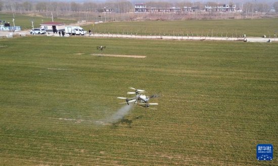 2月27日,植保無人機(jī)在山東省新泰市禹村鎮(zhèn)作業(yè)(無人機(jī)照片)。