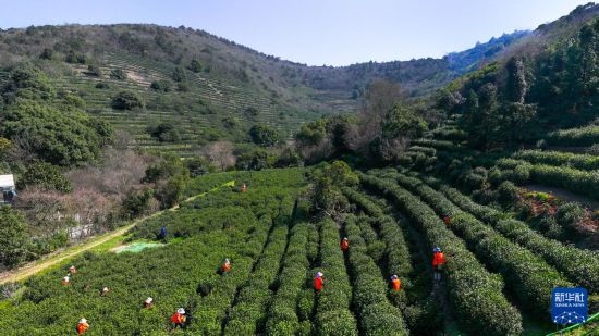 3月17日,在蘇州市吳中區(qū)西山國家現(xiàn)代農(nóng)業(yè)示范園金海華碧水緣茶葉基地,采茶工在碧螺春古茶園采茶(無人機照片)。