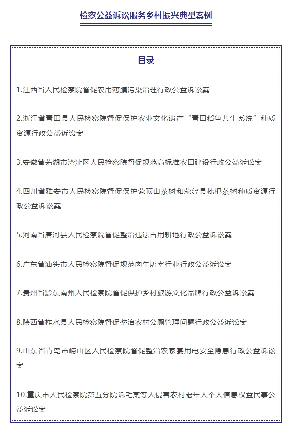 最高人民檢察院3月27日發(fā)布了一批檢察公益訴訟服務鄉(xiāng)村振興典型案例。這10件典型案例涉及耕地保護、農(nóng)村農(nóng)業(yè)文化遺產(chǎn)傳承、農(nóng)村人居環(huán)境改善、農(nóng)村安全生產(chǎn)、農(nóng)村特殊人群權益保護等方面,展現(xiàn)了檢察公益訴訟工作在服務鄉(xiāng)村振興各個方面所發(fā)揮的積極作用。