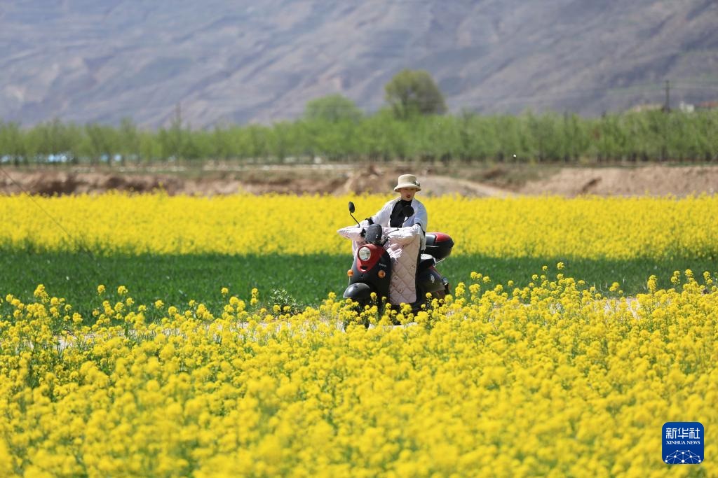 4月25日,在位于黃土高原的甘肅省天水市武山縣,當(dāng)?shù)卮迕耱T行經(jīng)過(guò)油菜花田。