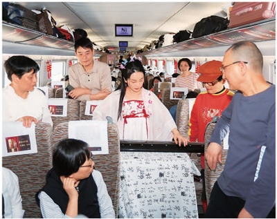 3月26日,在“樂游長三角”銀發(fā)旅游專列上,游客正在欣賞古琴表演。