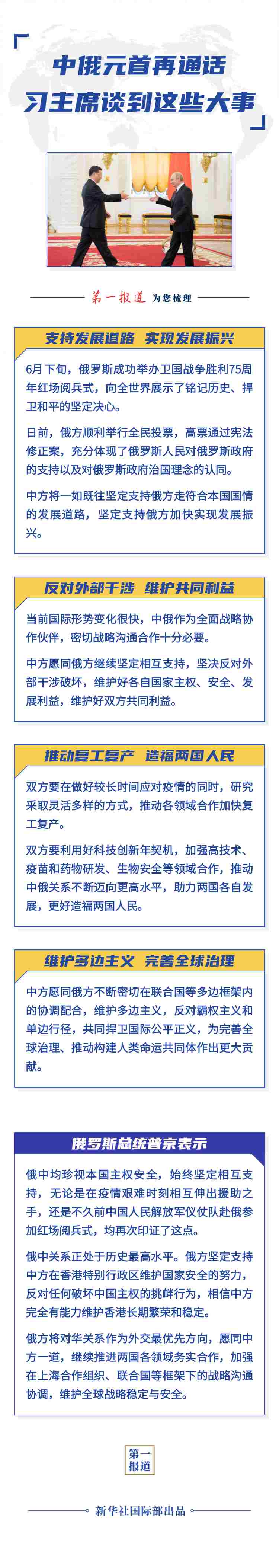 普京表示,近日俄羅斯全民投票高票通過憲法修正案,有助于維護俄長期政治穩(wěn)定,更好捍衛(wèi)國家主權,反對外部干涉。俄中均珍視本國主權安全,始終堅定相互支持,無論是在疫情艱難時刻相互伸出援助之手,還是不久前中國人民解放軍儀仗隊赴俄參加紅場閱兵式,均再次印證了這點。俄中關系正處于歷史最高水平。俄方堅定支持中方在香港特別行政區(qū)維護國家安全的努力,反對任何破壞中國主權的挑釁行為,相信中方完全有能力維護香港長期繁榮和穩(wěn)定。俄方將對華關系作為外交最優(yōu)先方向,愿同中方一道,繼續(xù)推進兩國各領域務實合作,加強在上海合作組織、聯(lián)合國等框架下的戰(zhàn)略溝通協(xié)調,維護全球戰(zhàn)略穩(wěn)定與安全。