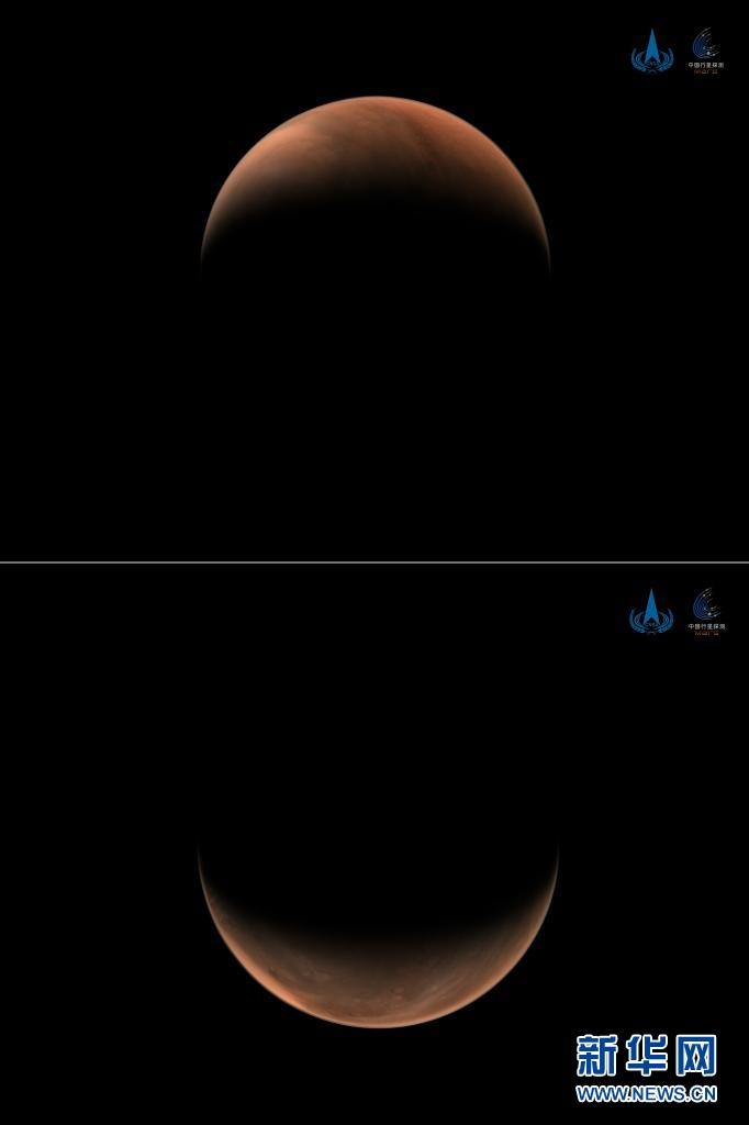 2021年3月26日,國(guó)家航天局發(fā)布2幅由我國(guó)首次火星探測(cè)任務(wù)天問一號(hào)探測(cè)器拍攝的南、北半球火星側(cè)身影像。這是一張拼版照片,上圖為:北半球上方火星影像;下圖為:南半球上方火星影像。