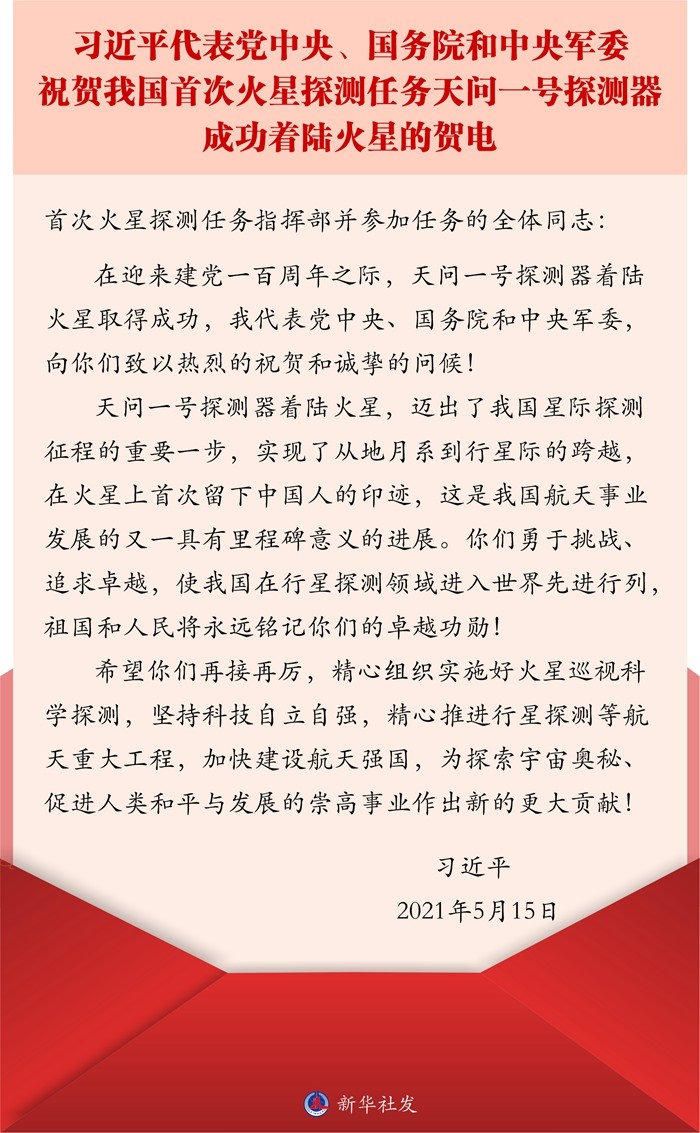 在迎來建黨一百周年之際,天問一號(hào)探測(cè)器著陸火星取得成功,我代表黨中央、國務(wù)院和中央軍委,向你們致以熱烈的祝賀和誠摯的問候!