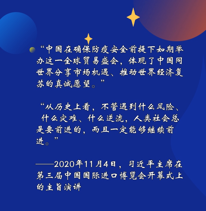 突如其來的新冠肺炎疫情給各國帶來嚴重沖擊,也給世界經(jīng)濟帶來重創(chuàng)。在2020年舉行的第三屆進博會上,習近平主席誠摯的話語,為世界注入強大信心——