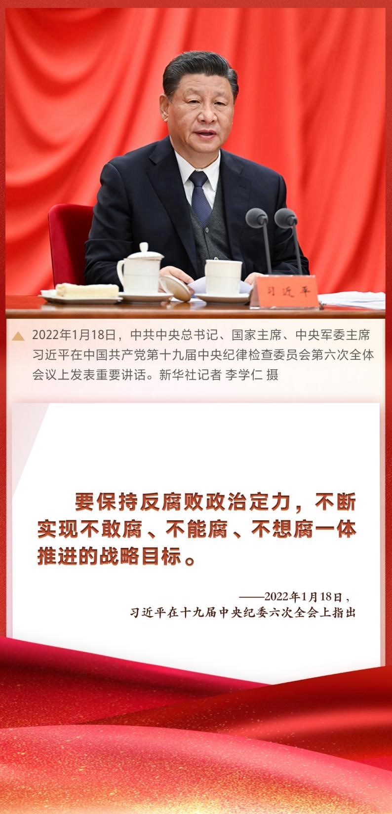 “要保持反腐敗政治定力,不斷實(shí)現(xiàn)不敢腐、不能腐、不想腐一體推進(jìn)的戰(zhàn)略目標(biāo)。”中共中央總書記、國家主席、中央軍委主席習(xí)近平在十九屆中央紀(jì)委六次全會(huì)上發(fā)表重要講話,深刻總結(jié)新時(shí)代黨的自我革命的成功實(shí)踐,深刻闡述全面從嚴(yán)治黨取得的歷史性、開創(chuàng)性成就,產(chǎn)生的全方位、深層次影響,對堅(jiān)持不懈把全面從嚴(yán)治黨向縱深推進(jìn)、迎接黨的二十大勝利召開作出戰(zhàn)略部署。