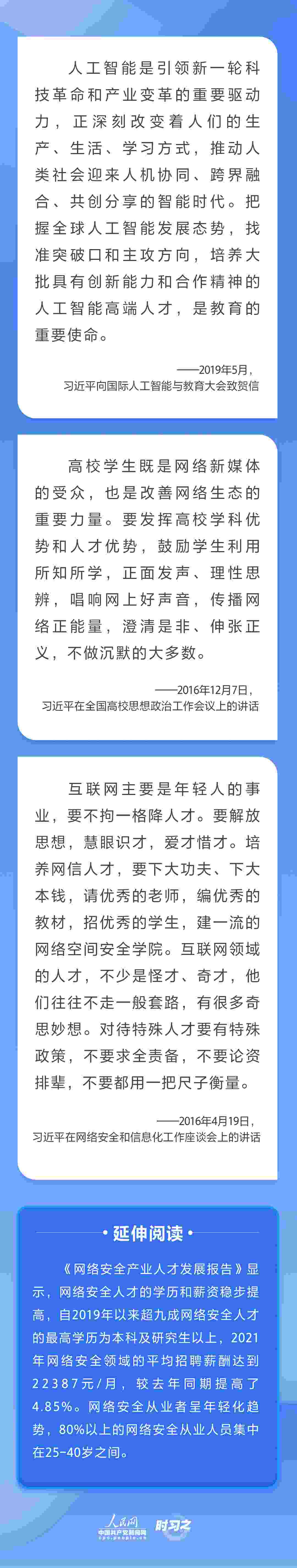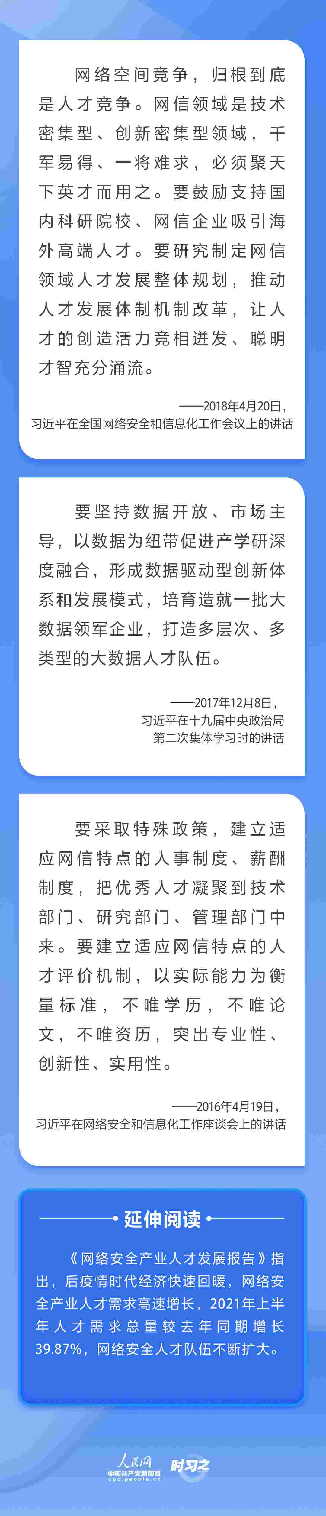“網(wǎng)信領域是技術(shù)密集型、創(chuàng)新密集型領域,千軍易得、一將難求,必須聚天下英才而用之?!秉h的十八大以來,習近平總書記多次就網(wǎng)信事業(yè)發(fā)展作出重要論述,并將抓好人才工作擺在治國理政的重要位置,為新時代網(wǎng)信人才工作和網(wǎng)信人才事業(yè)發(fā)展指明了前進方向。