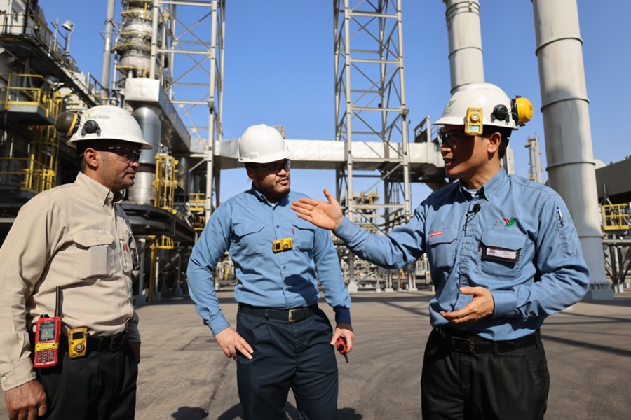 2022年11月27日,在沙特西部城市延布,中沙延布煉廠的員工在交流??偼顿Y86億美元的中沙延布煉廠是中國石化與沙特阿拉伯石油公司合資興建的項目,自2016年1月20日由兩國元首共同啟動投產(chǎn)以來,發(fā)展迅速。今年1月至8月累計實現(xiàn)利潤11.5億美元。