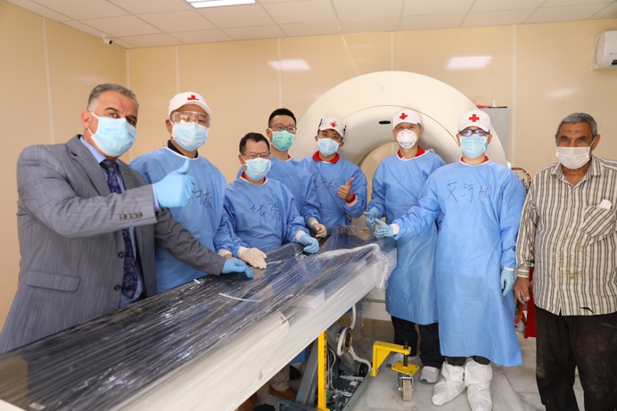 2020年4月12日,在伊拉克首都巴格達,援助伊拉克防治新冠肺炎的中國醫(yī)療專家將CT設(shè)備搬運到機房后與伊方人員合影。