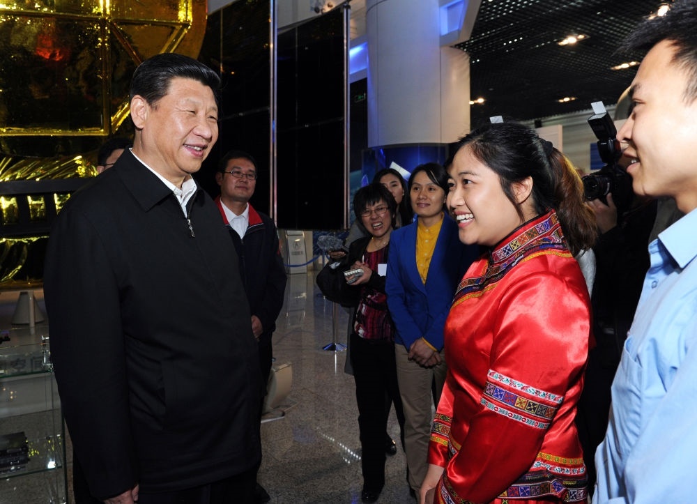 2013年5月4日,習(xí)近平來到中國(guó)航天科技集團(tuán)公司中國(guó)空間技術(shù)研究院,同各界優(yōu)秀青年代表座談并發(fā)表重要講話。這是座談會(huì)前,習(xí)近平和在展廳參觀的優(yōu)秀青年代表交談。