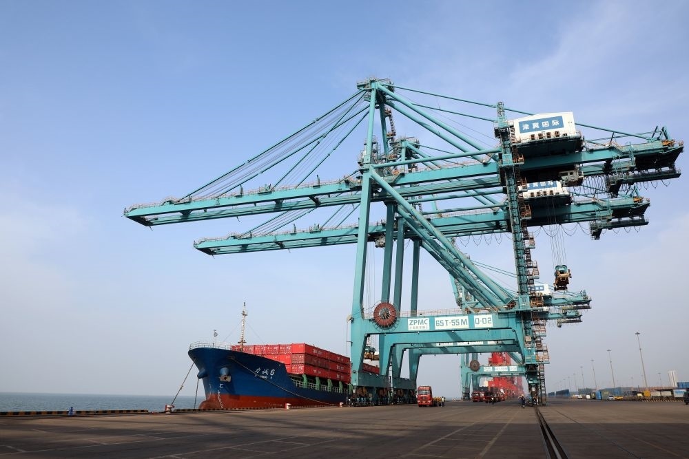 3月9日,船舶??吭邳S驊港綜合港區(qū)集裝箱碼頭進(jìn)行卸船作業(yè)。新華社記者 駱學(xué)峰 攝