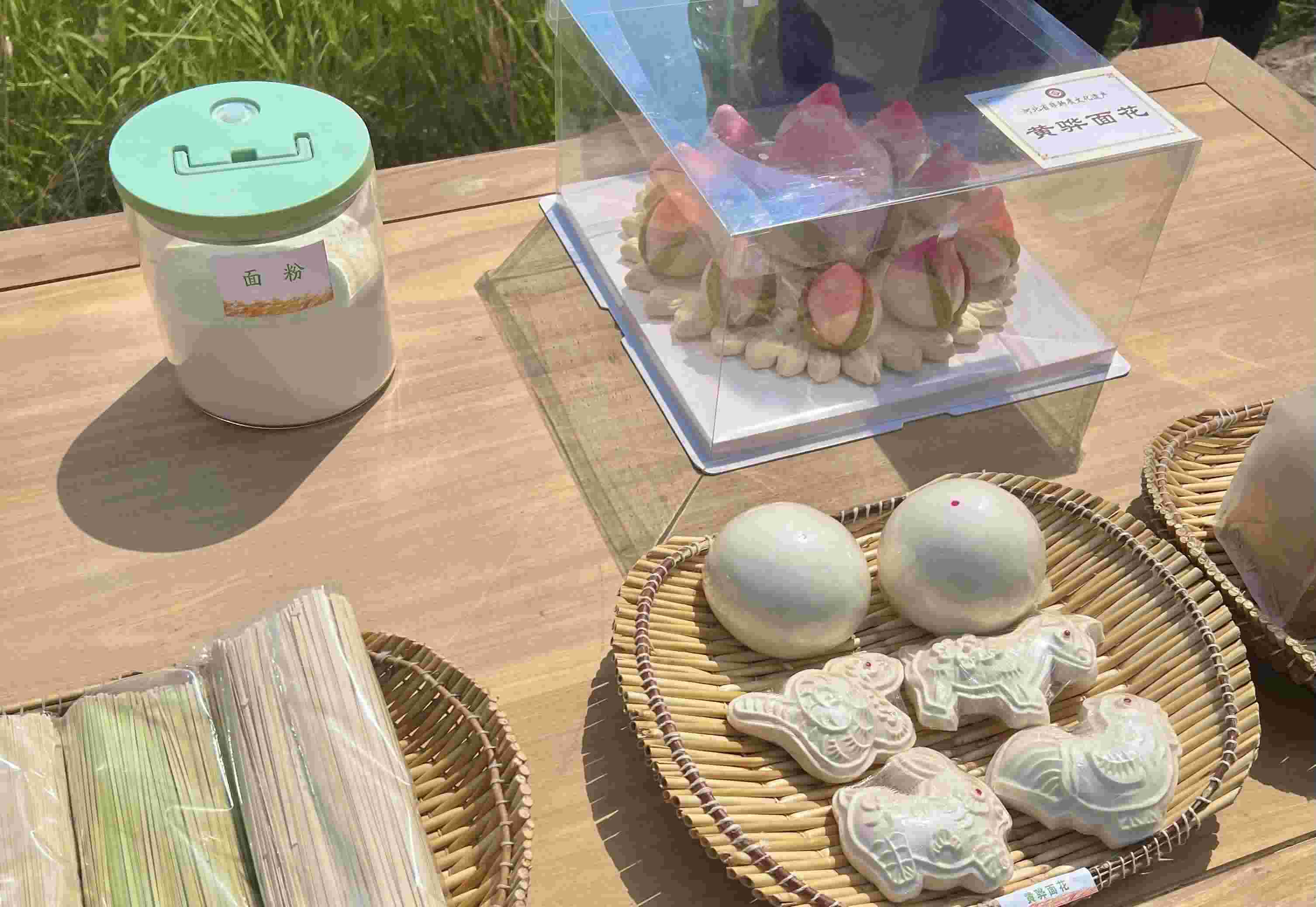 在楊東進家麥田的路邊,擺放著一張長方形的木桌。桌上擺放著用于展示的旱堿麥的植株和麥粒樣本,以及由旱堿麥制成的面粉、掛面、饅頭和黃驊面花等產(chǎn)品,總書記在這里駐足觀看。印刻著寓意吉祥圖案的黃驊面花,被列為省級非物質(zhì)文化遺產(chǎn)。