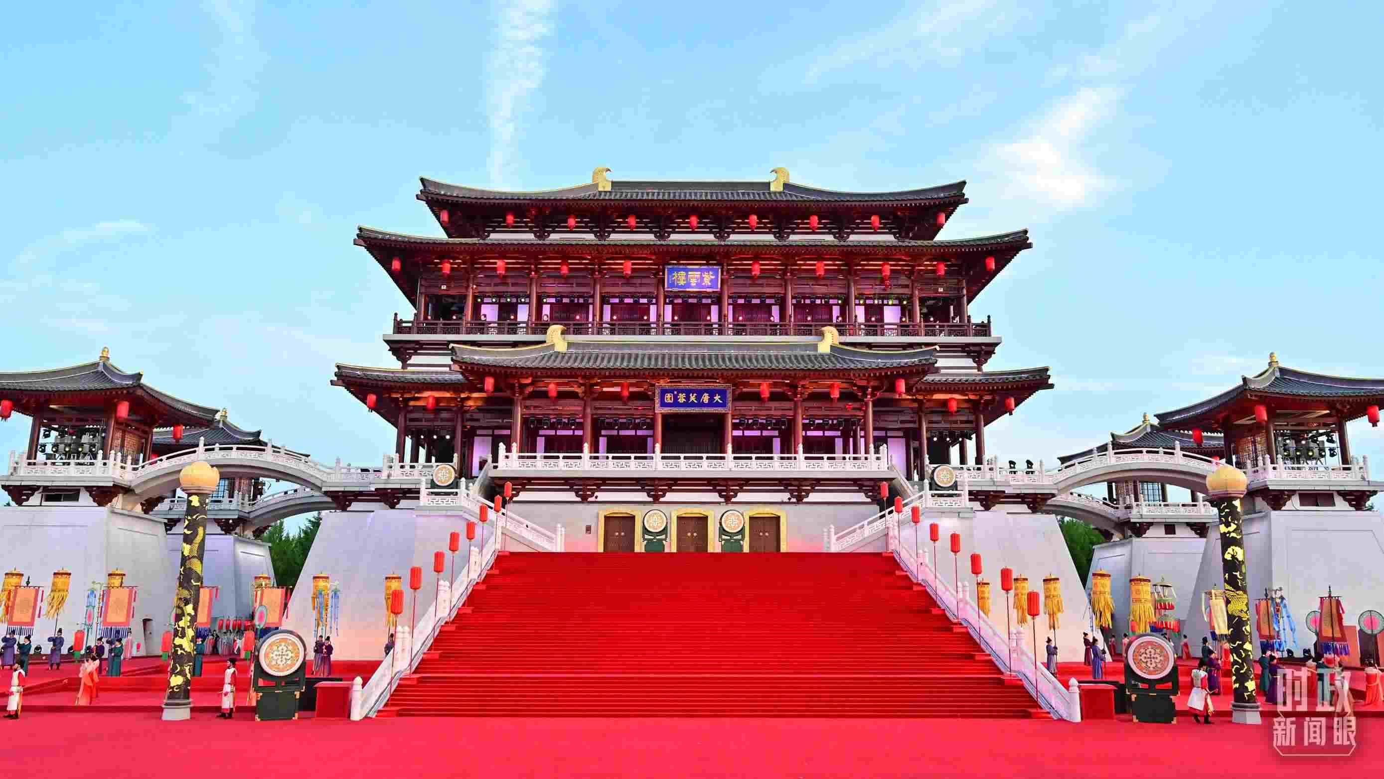△紫云樓是大唐芙蓉園最主要的仿唐建筑群之一。18日晚的迎賓表演就是以紫云樓為背景。(總臺(tái)央視記者劉琦拍攝)