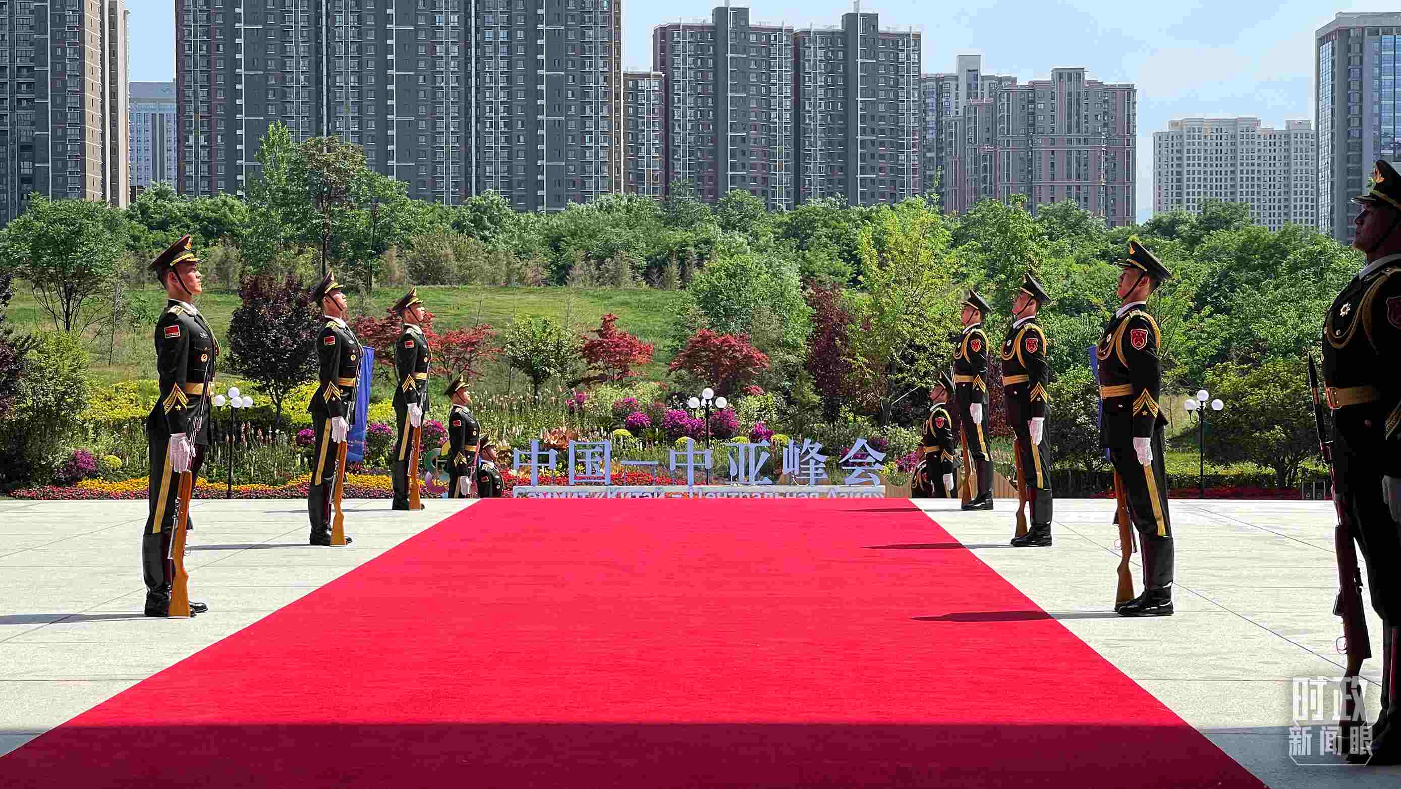 △陜西賓館會(huì)議中心外,禮兵列隊(duì)迎接貴賓。(總臺(tái)央視記者鐘信偉拍攝)