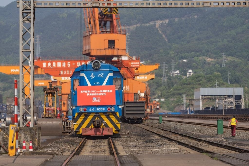 這是2023年4月27日,太平船務(wù)——西部陸海新通道江鐵海聯(lián)運非洲專列在重慶果園港魚嘴站等待發(fā)車。
