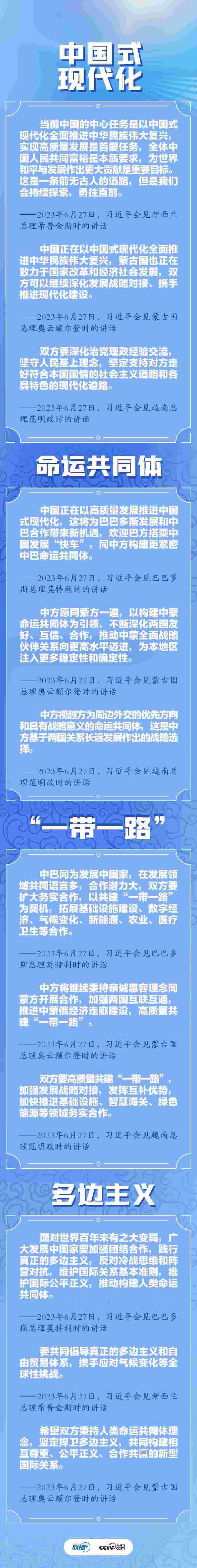 央視網(wǎng)《聯(lián)播+》梳理發(fā)現(xiàn),四場雙邊會(huì)見中,“中國式現(xiàn)代化”“命運(yùn)共同體”“一帶一路”“多邊主義”四個(gè)關(guān)鍵詞頻繁出現(xiàn)。