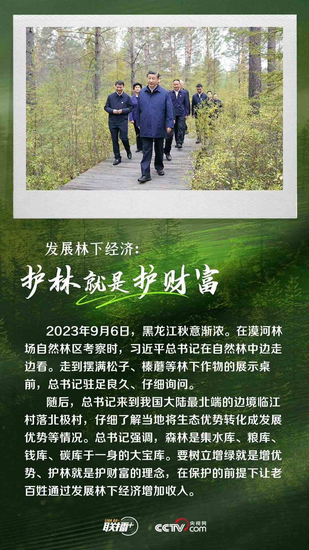9月6日,習(xí)近平總書記來到黑龍江省大興安嶺地區(qū)漠河市考察。他深入林區(qū),走進(jìn)鄉(xiāng)村,察看自然林生長(zhǎng)態(tài)勢(shì)和林下作物展示,仔細(xì)了解當(dāng)?shù)亟Y(jié)合地域優(yōu)勢(shì)發(fā)展特色旅游、將生態(tài)優(yōu)勢(shì)轉(zhuǎn)化成發(fā)展優(yōu)勢(shì)等情況。