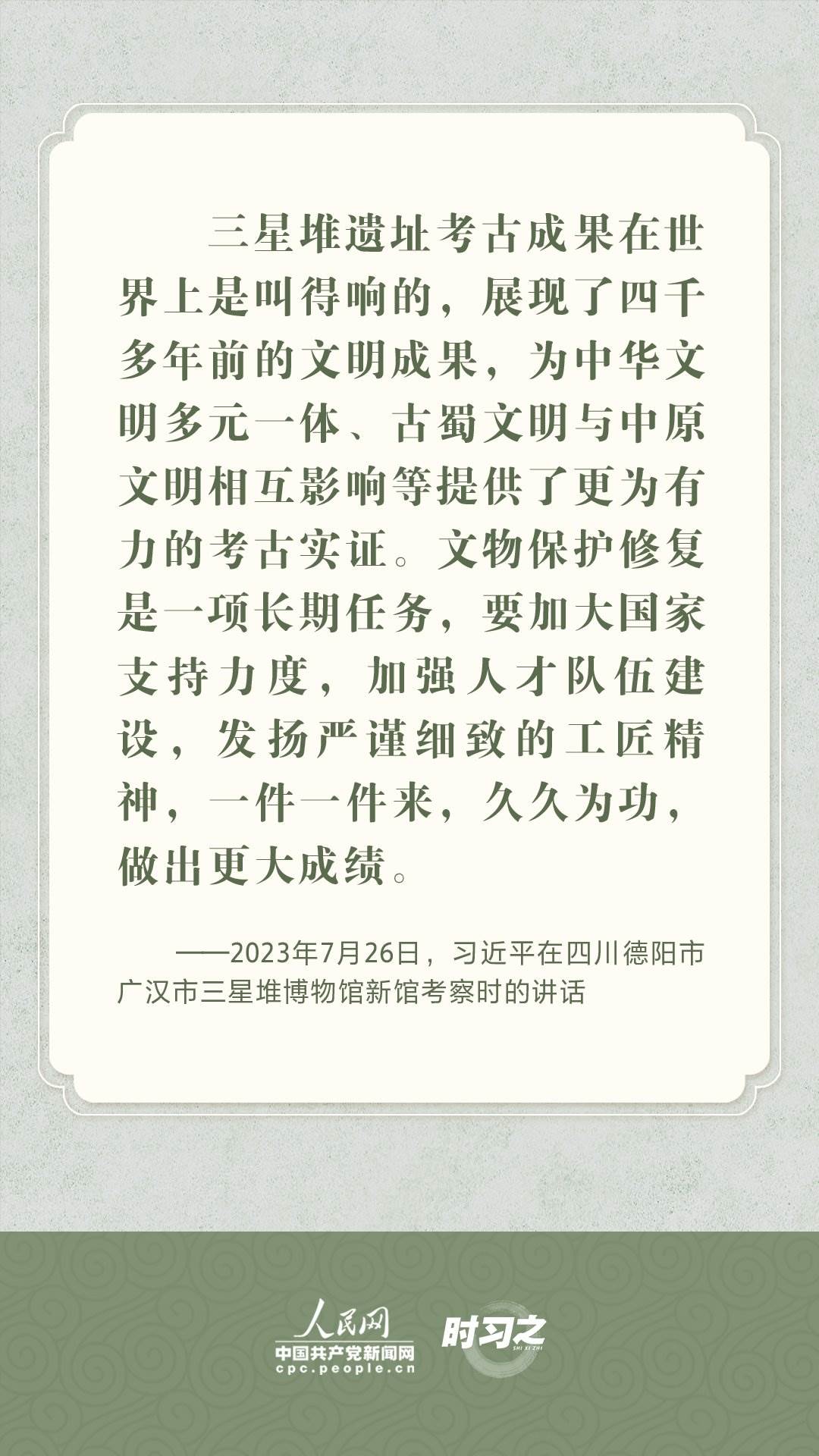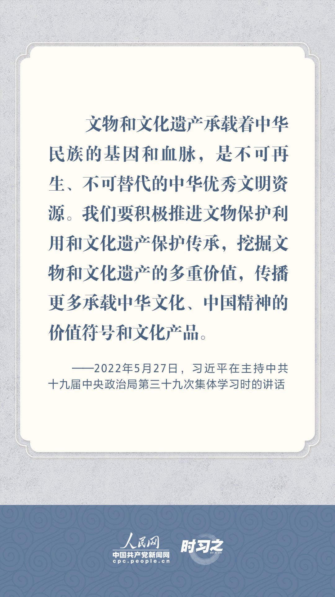 文物承載燦爛文明,傳承歷史文化,維系民族精神。習(xí)近平總書(shū)記站在中華民族和中華文明永續(xù)傳承的戰(zhàn)略高度,不斷強(qiáng)調(diào)保護(hù)傳承中華優(yōu)秀傳統(tǒng)文化,為增強(qiáng)文化自信、激發(fā)中華優(yōu)秀傳統(tǒng)文化的生機(jī)與活力注入了強(qiáng)大精神動(dòng)力。