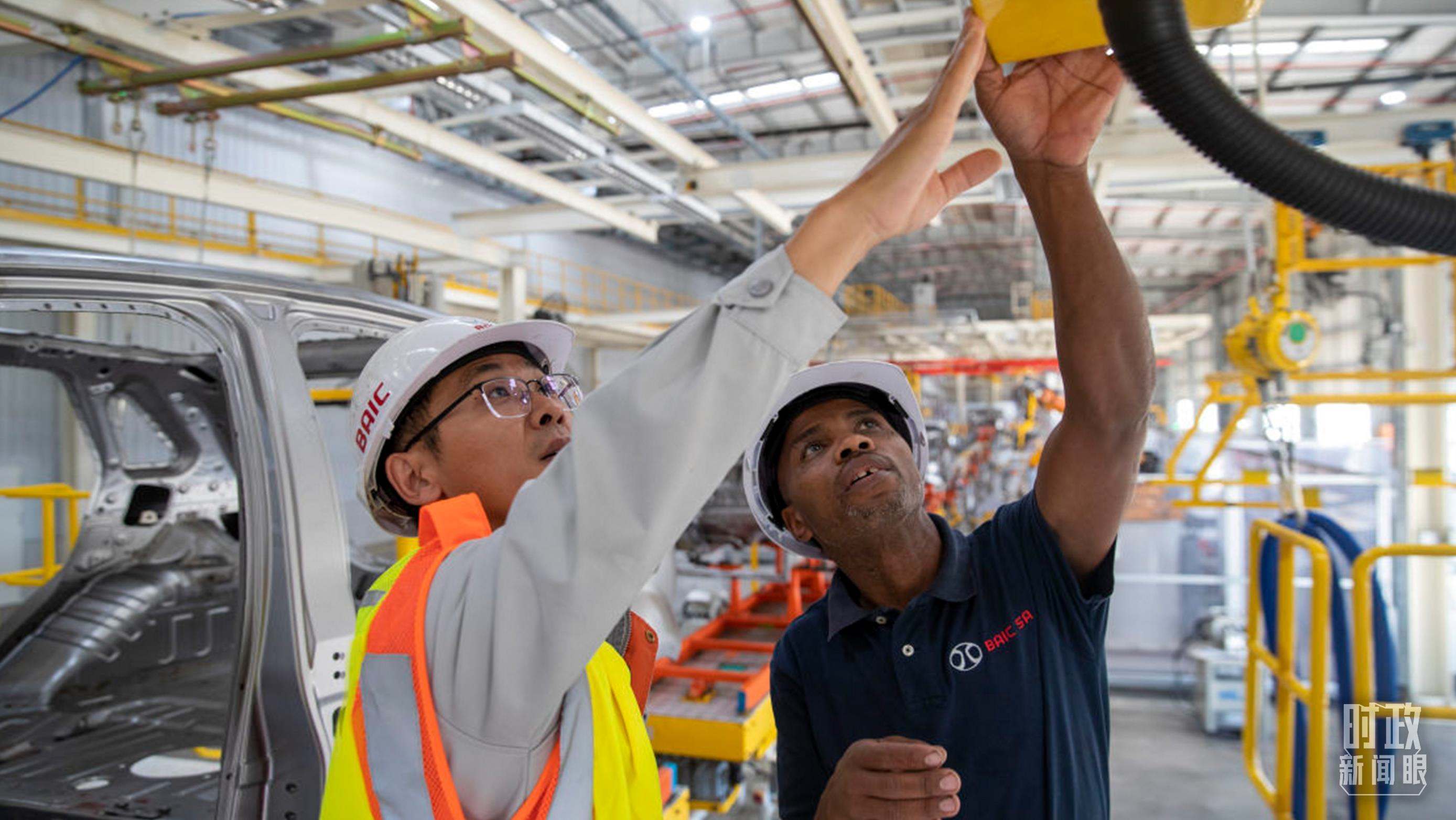 △在南非東開普省北汽南非工廠,當(dāng)?shù)貑T工與中國同事在焊裝車間內(nèi)工作。(資料圖)